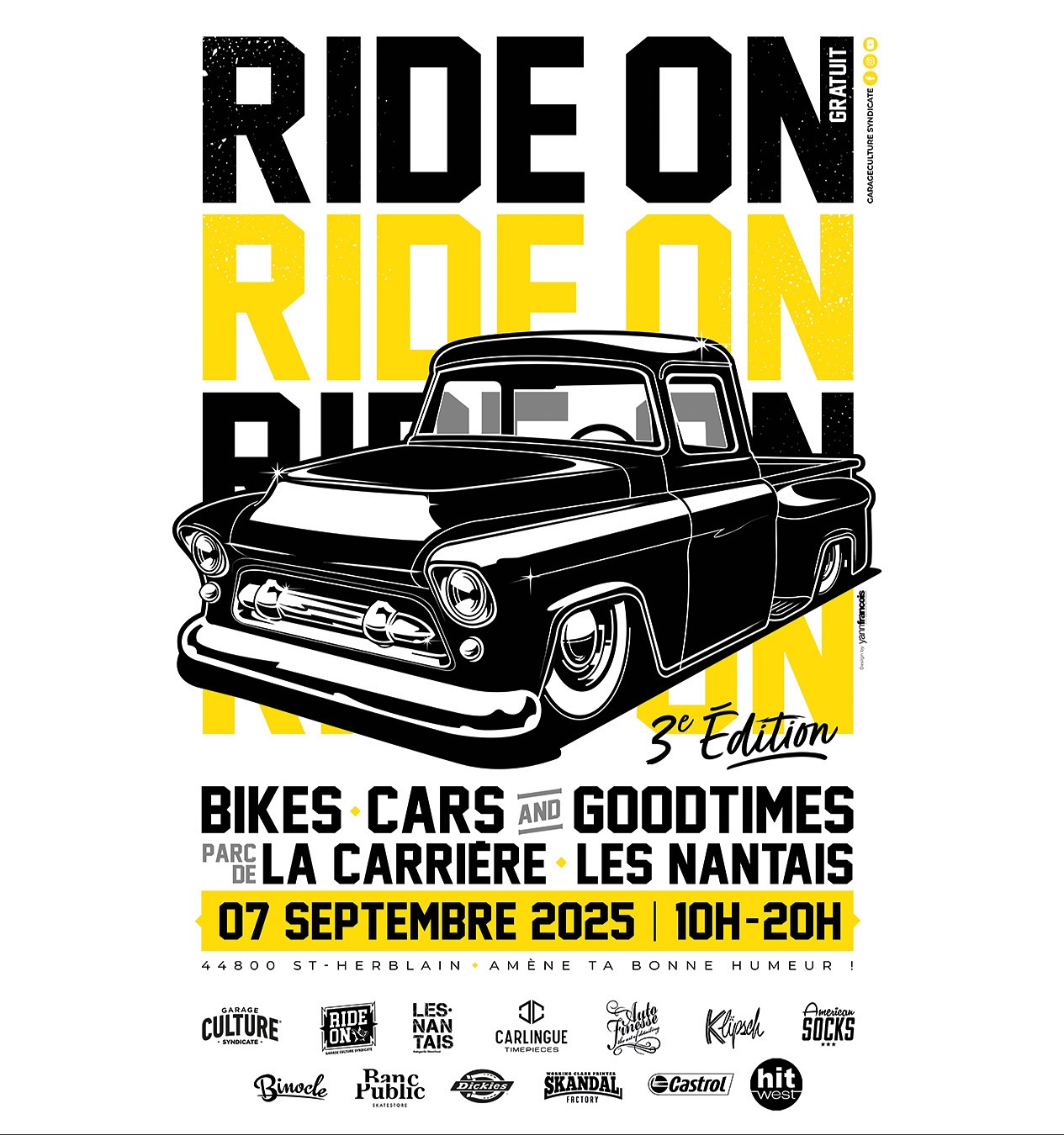 Après avoir réalisé la seconde édition du RIDE ON® et avoir rencontré un fort succès pour cette première édition avec 3 500 personnes sur la journée Garage Culture. Le RIDE ON® édition #3 se déroulera le DIMANCHE 07 SEPTEMBRE 2025 à la ginguette des nantais ainsi qu’à La Carrière ! Bikes show, cars show, concert(s) live, streetfood, exposition photo,… Continue reading Ride On